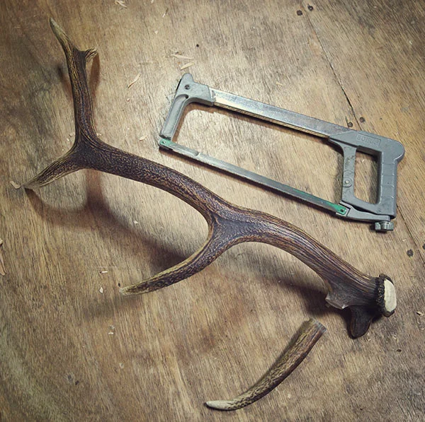 First I cut off the tines off the antler, as close as possible to the main stem, with a hacksaw. You want to make the most of the straighter part of the tine which is usually the part closest to it's base. Incidentally, you will discover what burning antler smells like. You can add that to the list of useless but kind-of-interesting things you know! The centre of the antler is porous, like the spongy centre of bones, but the outside layer is really incredibly hard. I suppose it is adapted as a weapon for bashing repeatedly against other antlers so it would have to be tough. The main part of the antler is a bit too large for a knife handle but maybe I'll use it for a parang or something later.